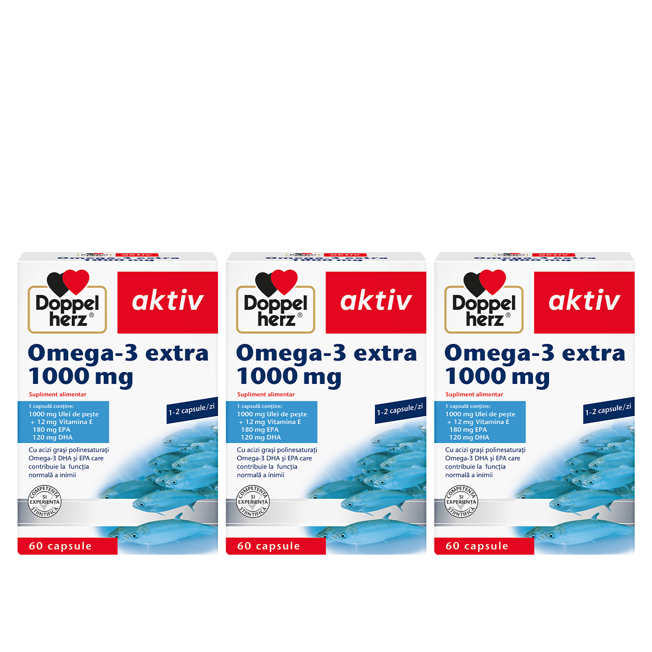 O capsulă de Doppelherz® aktiv Omega-3 Extra 1000 mg furnizează 180 mg EPA și 120 mg DHA, acizi grași Omega-3 care contribuie la funcția normală a inimii. În plus, fiecare capsulă Doppelherz® aktiv Omega-3 Extra 1000 mg conține 12 mg de Vitamina E, care contribuie la protejarea celulelor împotriva stresului oxidativ.